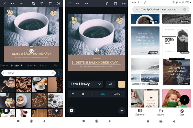 Do aplikace můžete nahrát vlastní fotky z galerie telefonu, zároveň je vám ale k dispozici i fotobanka. Některé prvky jsou zdarma, jiné placené. Prémiový účet, na kterém jsou zpřístupněné všechny prvky, stojí 300 Kč měsíčně, z vlastní zkušenosti ale můžeme říct, že se obejdete i bez něj.